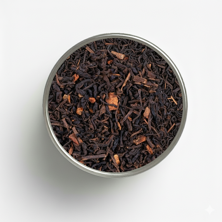 Thé noir Ceylon décaféiné, morceaux de cannelle, clou de girofle, cardamome, arôme naturel, vanille.